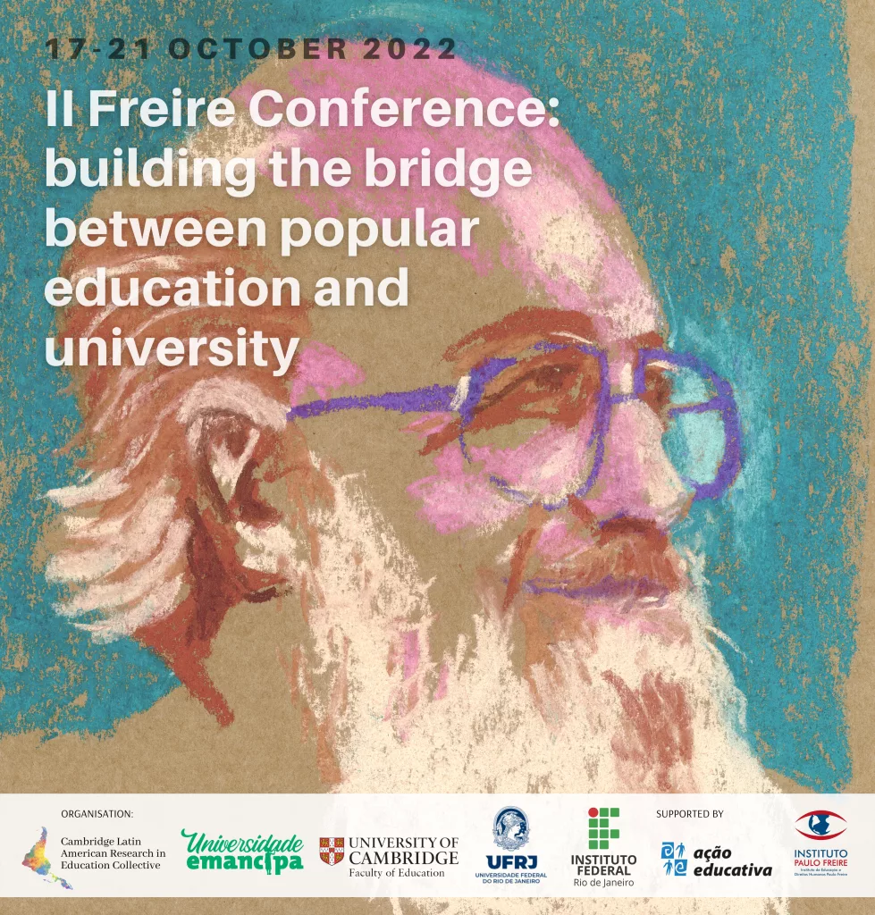 The “II Freire Conference: Building the bridge between popular education and university“, organised by the Cambridge Latin American Research in Education Collective (CLAREC) and Universidade Emancipa, will take place between the 17th and 21st of October 2022. It is an international, multicultural, and interdisciplinary initiative organised by a collective of people based in multiple academic institutions and social movements.