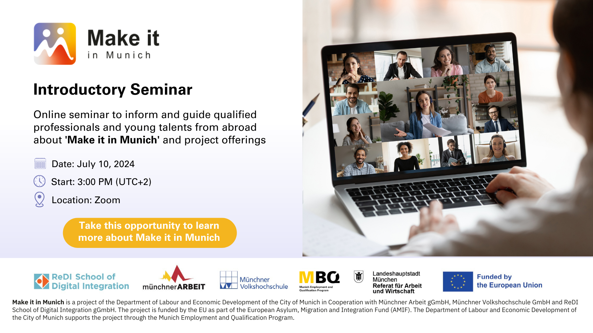 "𝐌𝐚𝐤𝐞 𝐢𝐭 𝐢𝐧 𝐌𝐮𝐧𝐢𝐜𝐡" is an innovative online migration project coordinated by the 𝐂𝐢𝐭𝐲 𝐨𝐟 𝐌𝐮𝐧𝐢𝐜𝐡 𝐃𝐞𝐩𝐚𝐫𝐭𝐦𝐞𝐧𝐭 𝐨𝐟 𝐋𝐚𝐛𝐨𝐫 𝐚𝐧𝐝 𝐄𝐜𝐨𝐧𝐨𝐦𝐢𝐜 𝐃𝐞𝐯𝐞𝐥𝐨𝐩𝐦𝐞𝐧𝐭’𝐬 #𝐌𝐁𝐐 𝐏𝐫𝐨𝐠𝐫𝐚𝐦𝐦𝐞 in collaboration with 𝐌ü𝐧𝐜𝐡𝐧𝐞𝐫 𝐀𝐫𝐛𝐞𝐢𝐭, 𝐑𝐞𝐃𝐈 𝐒𝐜𝐡𝐨𝐨𝐥 𝐨𝐟 𝐃𝐢𝐠𝐢𝐭𝐚𝐥 𝐈𝐧𝐭𝐞𝐠𝐫𝐚𝐭𝐢𝐨𝐧, and 𝐌ü𝐧𝐜𝐡𝐧𝐞𝐫 𝐕𝐨𝐥𝐤𝐬𝐡𝐨𝐜𝐡𝐬𝐜𝐡𝐮𝐥𝐞. The project is funded by the 𝐄𝐮𝐫𝐨𝐩𝐞𝐚𝐧 𝐔𝐧𝐢𝐨𝐧'𝐬 𝐀𝐬𝐲𝐥𝐮𝐦, 𝐌𝐢𝐠𝐫𝐚𝐭𝐢𝐨𝐧 𝐚𝐧𝐝 𝐈𝐧𝐭𝐞𝐠𝐫𝐚𝐭𝐢𝐨𝐧 𝐅𝐮𝐧𝐝 (𝐀𝐌𝐈𝐅) and administered by the 𝐅𝐞𝐝𝐞𝐫𝐚𝐥 𝐎𝐟𝐟𝐢𝐜𝐞 𝐟𝐨𝐫 𝐌𝐢𝐠𝐫𝐚𝐭𝐢𝐨𝐧 𝐚𝐧𝐝 𝐑𝐞𝐟𝐮𝐠𝐞𝐞𝐬 (𝐁𝐀𝐌𝐅).